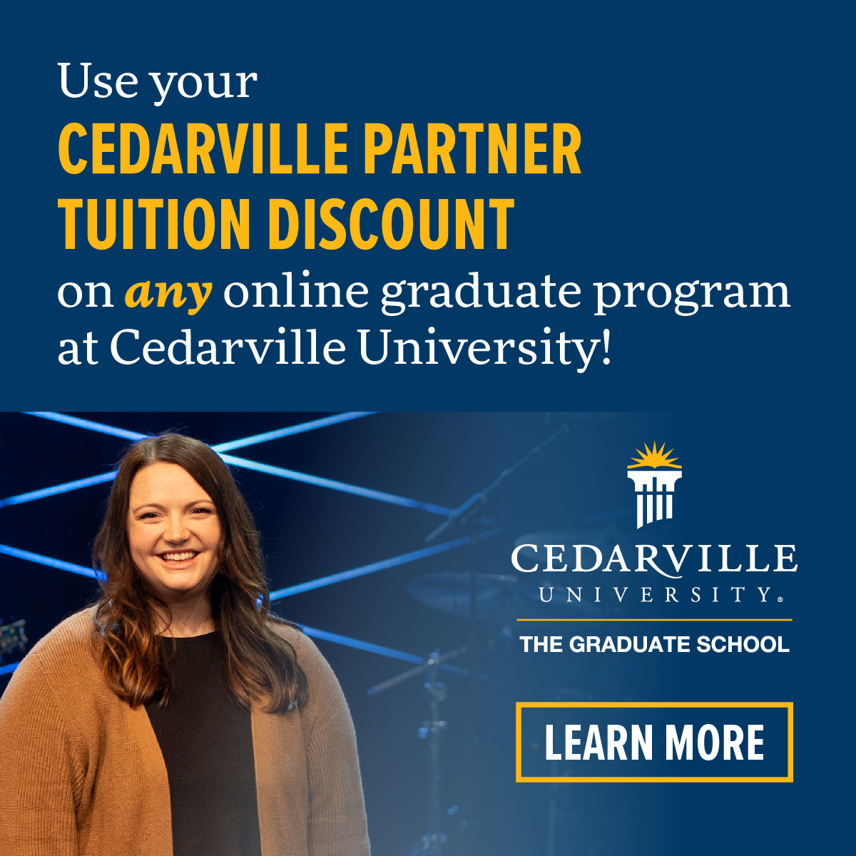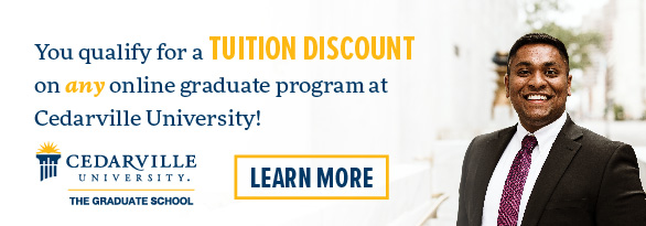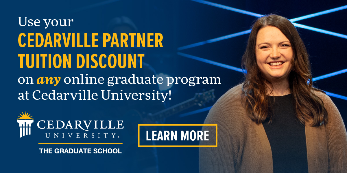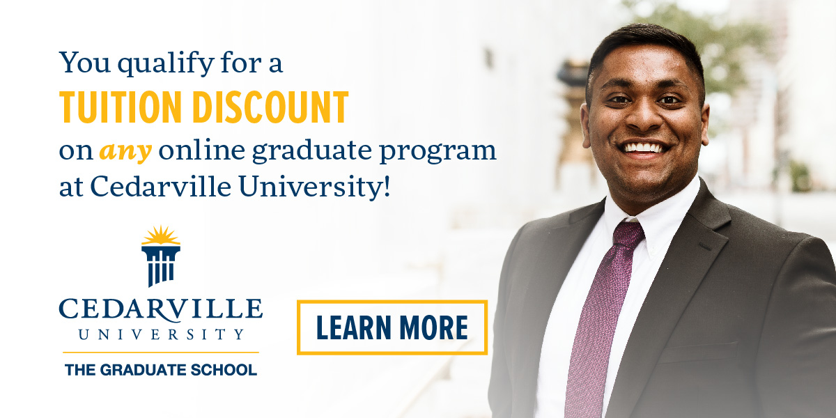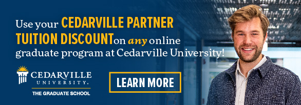 Cedarville offers online graduate programs in business, communication, innovation, leadership, ministry, nursing, and worship. Each program includes a distinct biblical worldview and offers practical, hands-on application. You can complete your program in one to two years in convenient seven-week online courses, and you’ll have a dedicated program advisor who will help you stay on track. And, competitive tuition and the CU Partners discount make Cedarville’s graduate programs an affordable option.